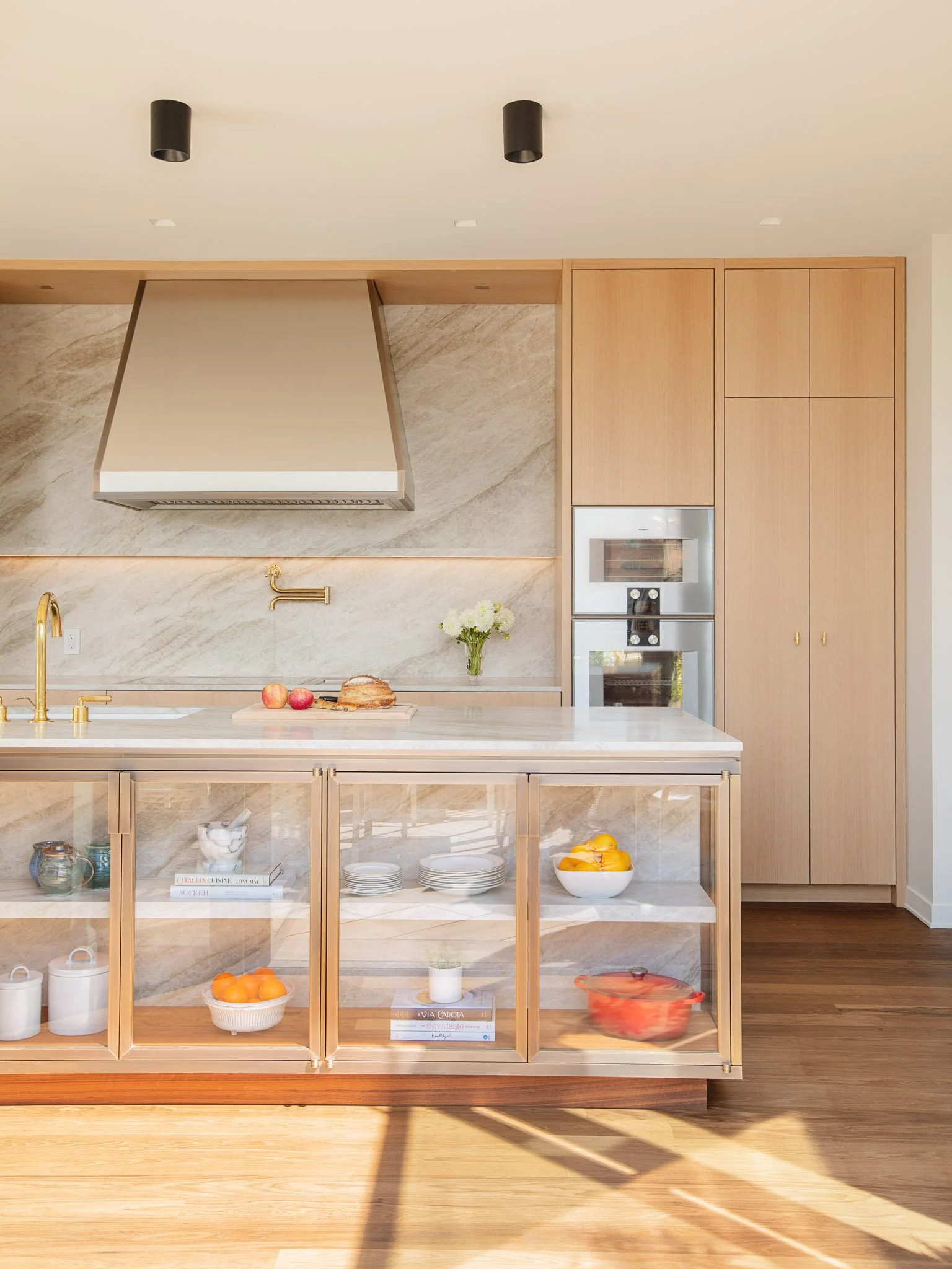 Added millwork, glass cabinetry and a custom nickel hood in a “warm modern” style. Selected warm wood tones and authentic, luxurious materials for a unique yet timeless design.